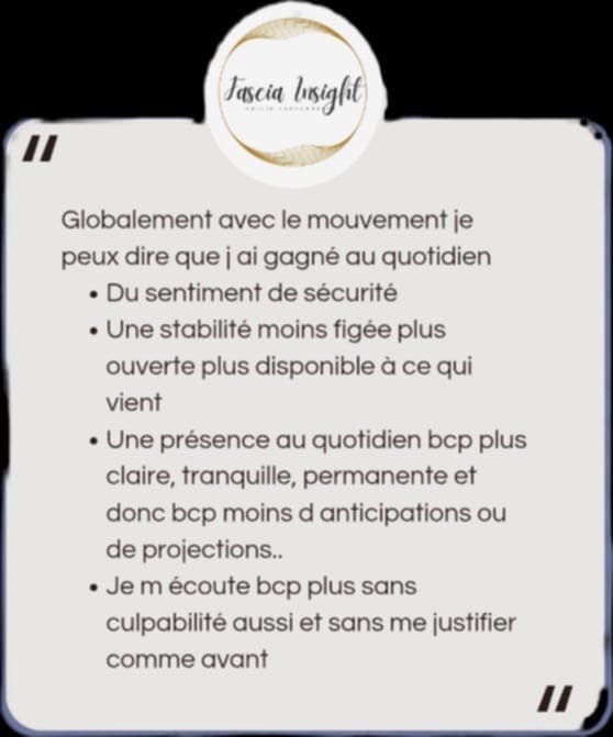 "Ces séances ont modifié quelque chose de la perception que j ai de moi, de ma manière d être sur terre si on peut dire comme ça. Il y a comme une remise en question de mon fonctionnement et de la manière que j ai de ne pas m'écouter.